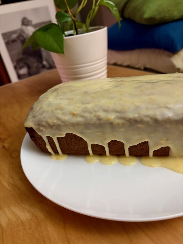 Dorie calls for her version to be glazed with a mix of marmalade and boiling water but because the top of mine had not formed a dome-like shape as many loaf cakes do (maybe because of my substitutions?), it wasn’t the prettiest so I went with a simple icing sugar glaze made with clementine juice and some more zest. Maybe not pretty but it was SO good (people were scraping the serving plate!).