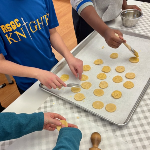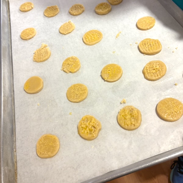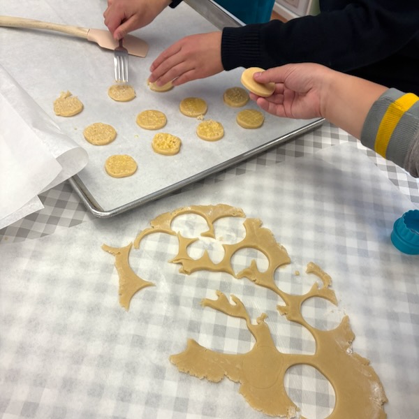 The cookies get scored on top with a fork and then eggwashed. Ours were a wee bit rustic (and our dough was warm after all those little hands had rolled and cut and re-rolled!) but they worked out!