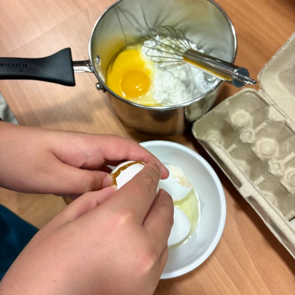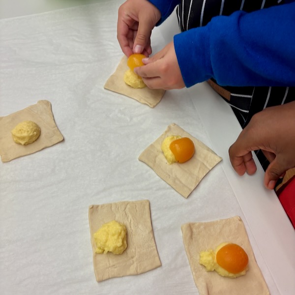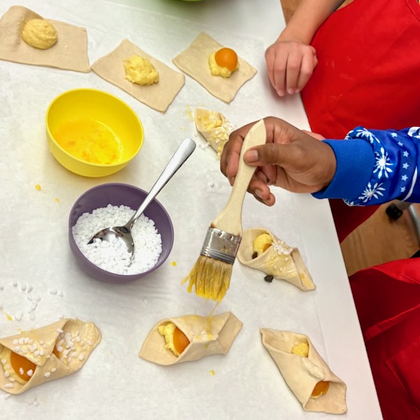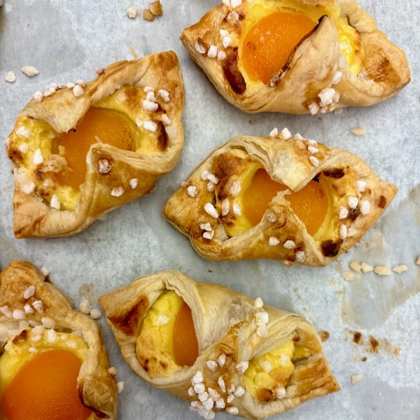 In our most recent baking session, Les Petits Chefs baking club made a favourite easy recipe of mine – especially so because it looks so much more complicated than it actually is! The recipe involves crème pâtissière (pastry cream), fruit (in this case, apricots), and puff pastry (with some bonus pearl sugar if you can get a hold of it) and to make sure we had enough (and enough time!) I made a batch of this earlier in the day.