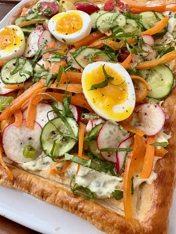 This week’s Tuesdays with Dorie recipe comes from Baking with Dorie. Vegetable Ribbon Tart is a tart only really in name as it consists of a layer of puff pastry that is baked on its own, topped with hummus and “ribboned” vegetables (that have been thinly sliced wither with a mandoline or, in my case, a vegetable peeler and some care!) that are tossed in a vinaigrette. So it’s a salad on a dip on a cracker… kind of! You amp it up and make it into a more substantial meal by adding some soft-boiled eggs but in no way do I think this constitutes a “tart”. I’m not sure what I’d call it, actually!