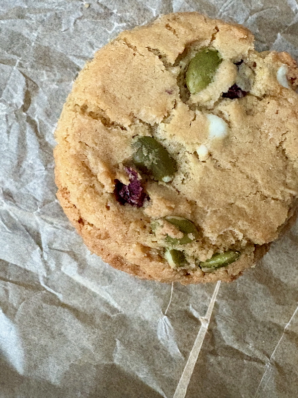 Today’s treat is one that isn’t necessarily “holiday” themed – apart from the red, green and white colours in the cranberries, pepitas (pumpkin seeds) and white chocolate chips – it’s a riff on my Game Day Cookies that works well as a cookie to gift, to serve at a holiday gathering OR to enjoy as you power through your “to do” list!